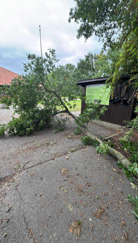 Der er opdaget store grene, som er brækket af træet ved boldskuret. Årsagen er endnu ukendt – det kan skyldes kraftig vind eller råd i træet. Vi har informeret kommunen og bedt dem om at tage hurtig handling.